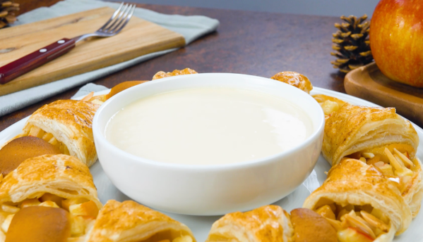 - Recouvrez la pâte autour du bol de compote de pommes. Répartissez des dés de pommes, des tranches de massepain et des éclats d'amandes sur la compote. Retirez le saladier et découpez la partie non garnie de la pâte feuilletée en forme d'étoile à l'aide d'une roulette à pizza. Rabattez les triangles de pâte ainsi obtenus sur la garniture et appuyez sur les extrémités. Badigeonnez la pâte de beurre à la cannelle et enfournez la plaque pendant environ 30 minutes à 180 °C. Pour servir, placez un bol de crème anglaise au centre de l'anneau aux pommes.