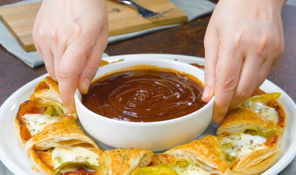 - Recouvrez la pâte feuilletée autour du saladier de sauce tomate. Répartissez de la mozzarella râpée, des tranches de salami, des poivrons et des tranches de mozzarella dessus. Retirez le saladier et découpez la partie non garnie de la pâte feuilletée en forme d'étoile à l'aide d'une roulette à pizza. Rabattez les triangles de pâte obtenus sur la garniture et appuyez sur les extrémités. Enduisez la pâte feuilletée d'œuf battu et saupoudrez-la d'origan. Enfournez la plaque pendant environ 30 minutes à 180 °C. Pour servir, placez un bol de sauce BBQ au centre de l'anneau façon pizza.