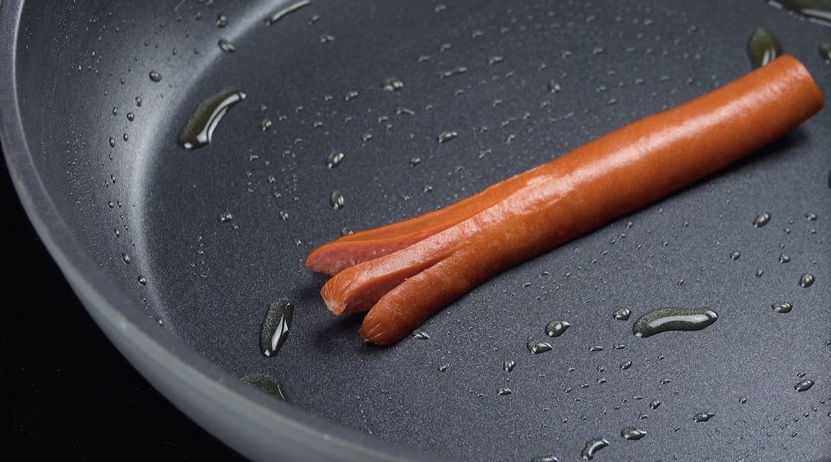 3.3) Coupez une saucisse en deux puis de nouveau en deux sur un côté d’environ 2 à 3 cm. Faites-la frire dans la poêle ; coupez la deuxième saucisse en petites tranches et faites-les frire des deux côtés.