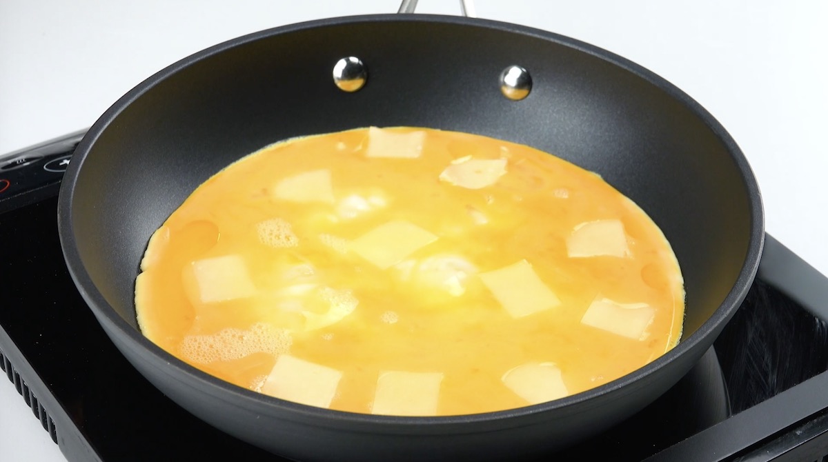 1.4) Versez un œuf cru dans la fleur et faites cuire le tout jusqu’à ce que le blanc d’œuf soit prêt.