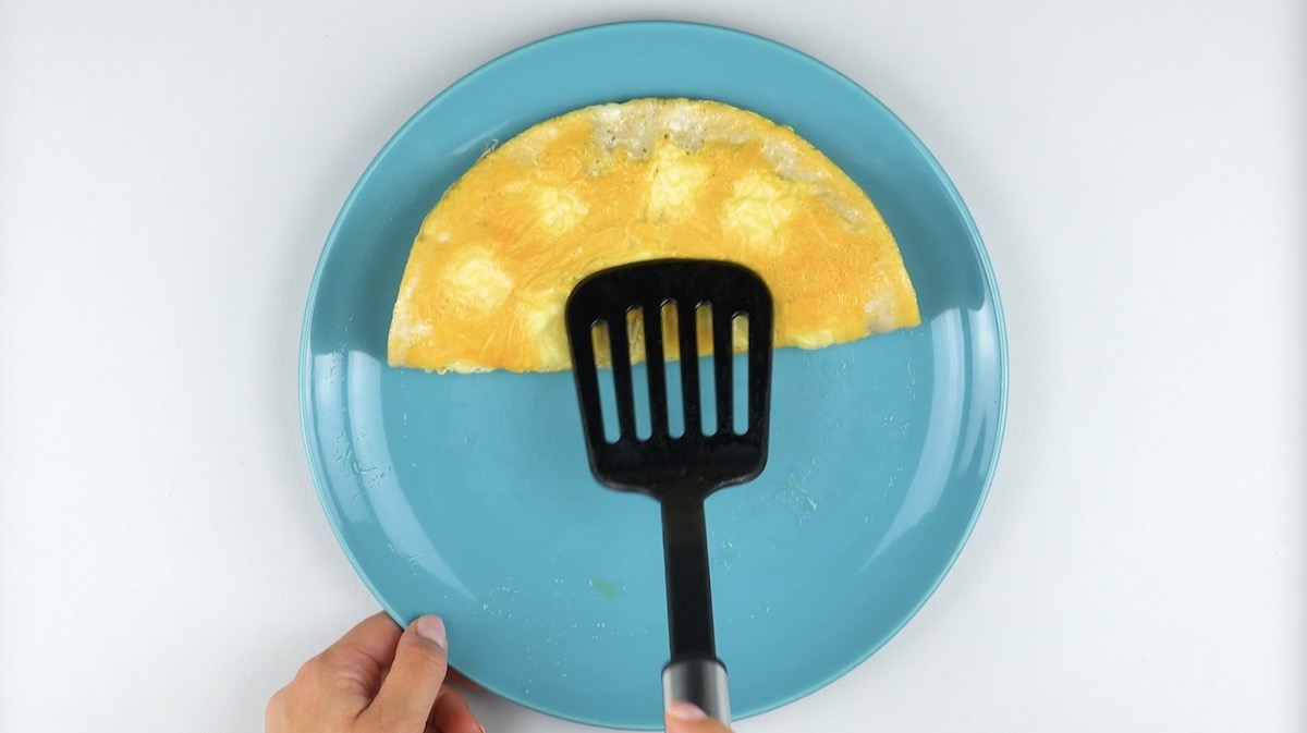 3.2) Mettez l’omelette sur une assiette avec le côté frit vers le haut et la plier de façon à ce que le côté fromage soit vers le haut.