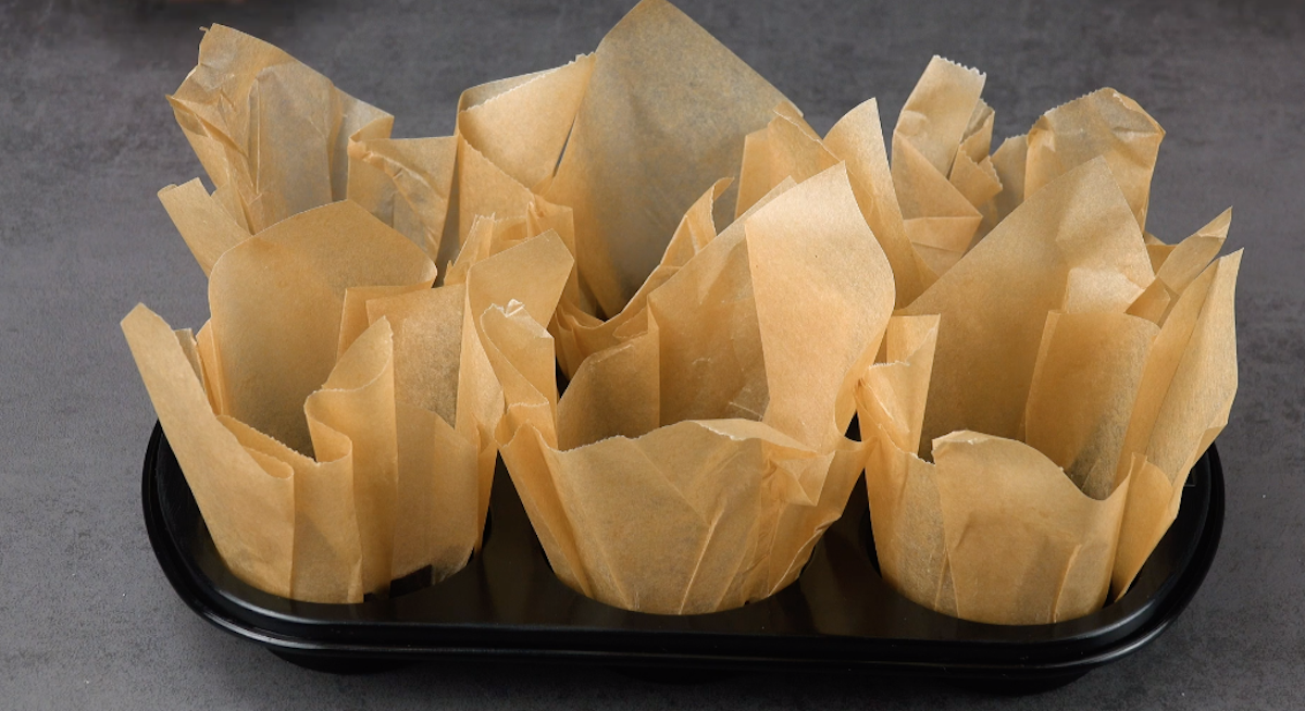 Découpez le papier sulfurisé en petits carrés et placez-les dans un creux du moule à muffins. Placez un verre dedans et tournez-le vers la gauche et la droite pour créer la forme désirée. Ensuite, vous pouvez ajouter la pâte.