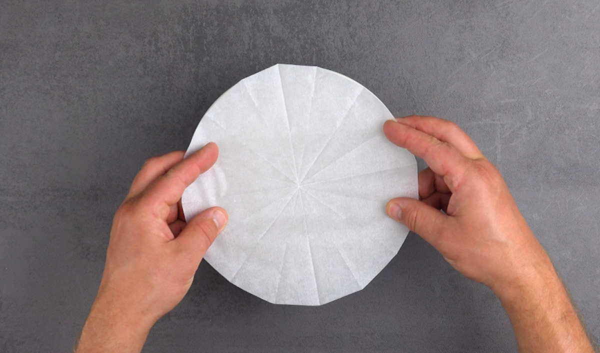Pliez un morceau de papier sulfurisé, comme le montre la vidéo, et mesurez le rayon du futur cercle. Découpez ensuite le papier à l’endroit approprié et vous obtenez un cercle de papier sulfurisé de la bonne dimension.