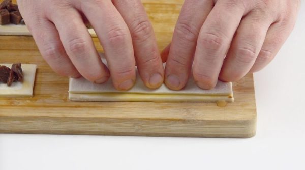- Déposez 3 bandes de pâte feuilletée sur une plaque à pâtisserie recouverte de papier sulfurisé. Maintenant, déposez quelques pépites de Nutella sur les bandes. Étalez du jaune d'oeuf sur les bords de la pâte et déposez une autre bande de pâte feuilletée sur le dessus. Pressez les bords avec une fourchette pour bien sceller le tout. Enduisez ensuite toute la pâte d'oeuf avant d'enfourner vos préparations à 180 °C pendant 12 minutes. Pour décorer, vous pouvez ajouter du sucre glace et des framboises.