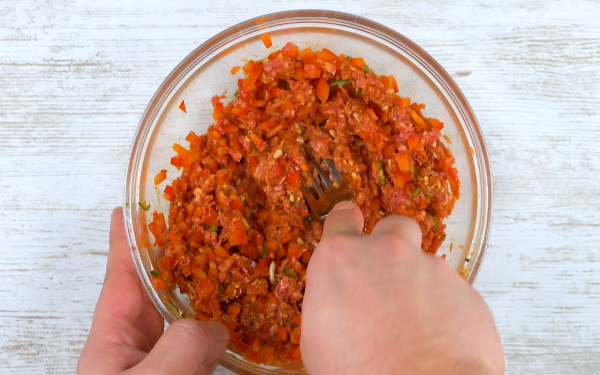 - Mettez la viande hachée dans un saladier et ajoutez le piment, le poivron et l'ail après avoir tout coupé en petits morceaux. Assaisonnez de sel, de poivre, de cumin et de paprika. Enfin, ajoutez 1 cuillère à soupe d'huile d'olive et mélangez bien.