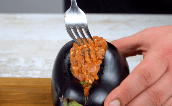 - Coupez le centre des aubergines dans le sens de la longueur et remplissez-les avec le mélange de viande hachée. Remplissez les aubergines de viande hachée ou mettez-en un peu de côté et faites des boulettes de viande.