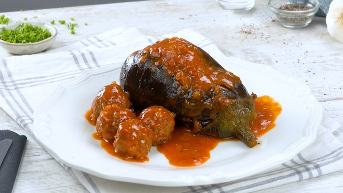 - Coupez l'oignon en petits morceaux et mettez-les dans une casserole avec l'huile d'olive et le romarin. Ajoutez les tomates - si vous le souhaitez, vous pouvez les assaisonner avec du poivre. Mettez les aubergines farcies dans la casserole et laissez mijoter à feu moyen pendant environ 25 minutes. S'il vous reste de la viande hachée (de l'étape 3), faites-en des boulettes et ajoutez-les à la sauce tomate et aux aubergines dans la casserole. (Les boulettes nécessitent au moins 5 minutes de cuisson.) Enfin, décorez les aubergines avec du persil haché.