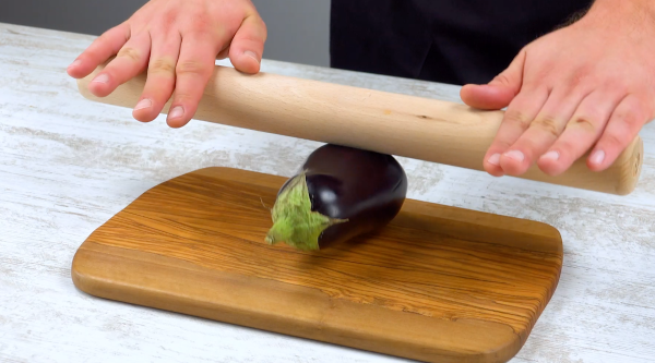 - Lavez les aubergines et pressez-les dans votre main ou aplatissez-les doucement avec un rouleau à pâtisserie pour ramollir leur chair.
