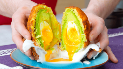 - Coupez les avocats en deux et retirez le noyau et la peau. Placez un œuf dans le creux du noyau. Astuce : les œufs ne doivent pas être trop durs et le jaune doit idéalement être encore liquide.