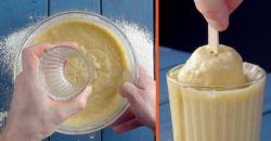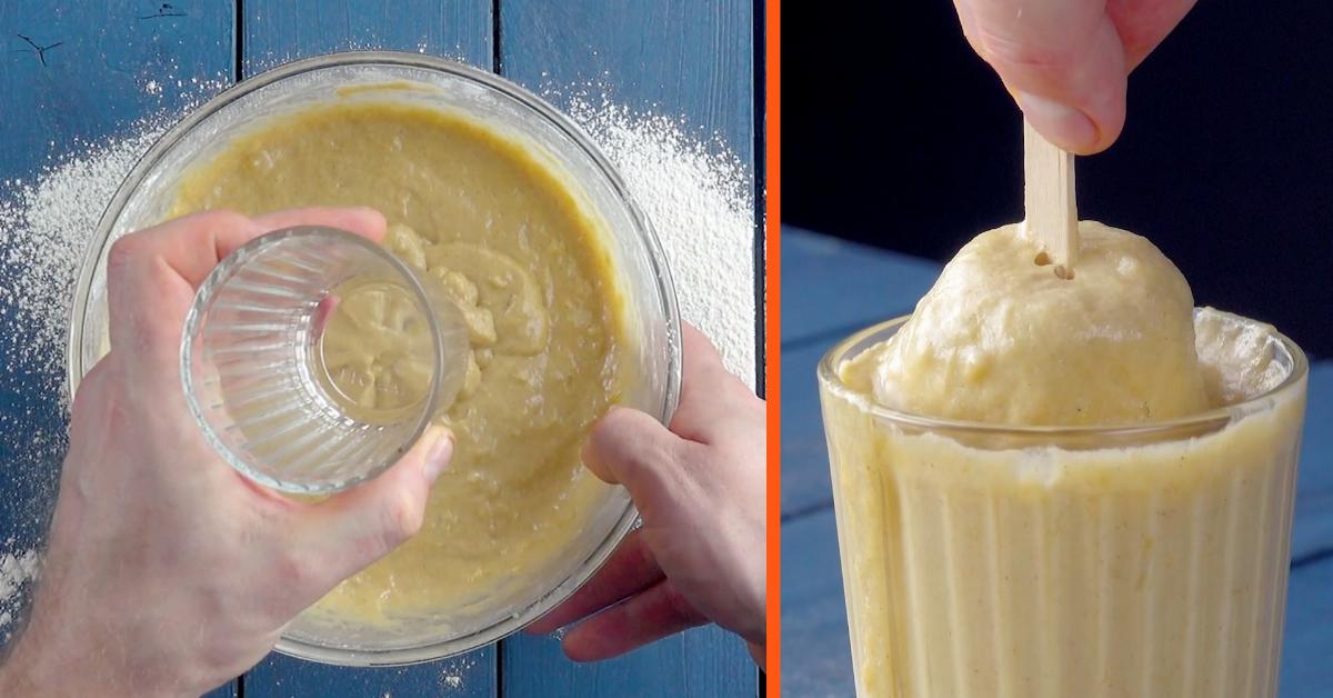 • Remplissez un grand verre avec la pâte et trempez-y complètement les bâtonnets de bananes congelées.
