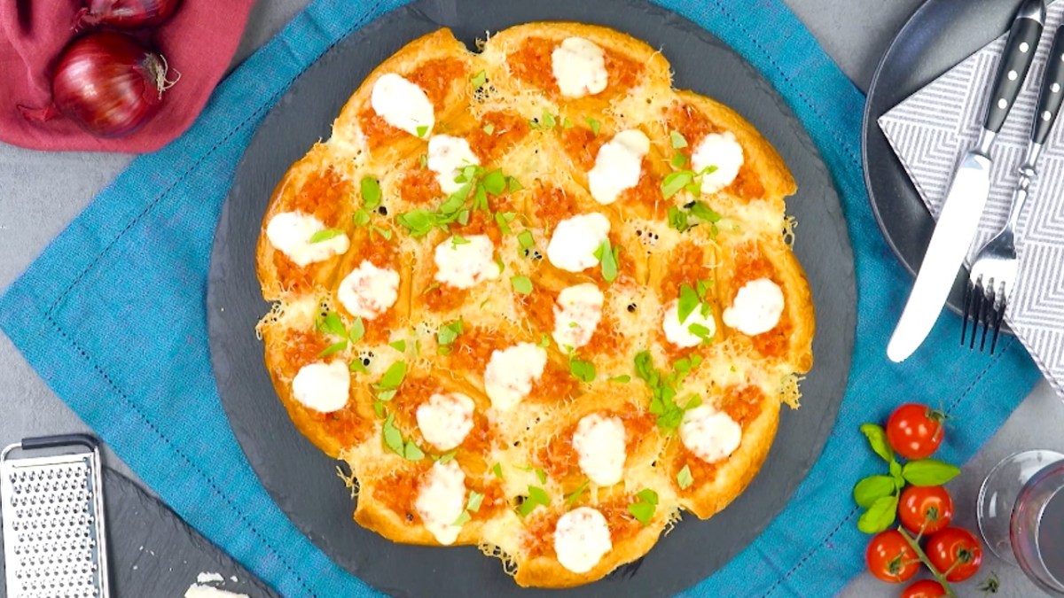 - Mélangez les tomates avec les oignons, l'ail, l'huile d'olive, le sel et le poivre. Découpez des cercles dans la pâte feuilletée (ø environ 10 cm). Roulez les cercles un peu des deux côtés et pressez les extrémités ensemble pour former des petites barques. Placez les barques dans une poêle ou un plat allant au four et remplissez-les avec le mélange de tomates. Placez une petite boule de mozzarella sur chaque barque. Badigeonnez la pâte feuilletée d'œuf battu et saupoudrez de fromage râpé. Enfournez à 180 °C pendant 25-30 minutes. Pour servir, saupoudrez de parmesan et de basilic frais.