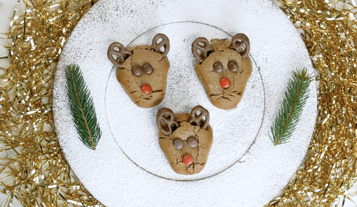 4.1 Formez des morceaux ronds de la taille d’une balle de ping-pong à partir de la pâte. Ensuite, utilisez vos mains pour leur donner la forme d’une tête de renne et faites-les cuire pendant environ 12 à 15 minutes à 165 °C.