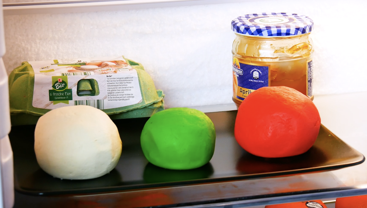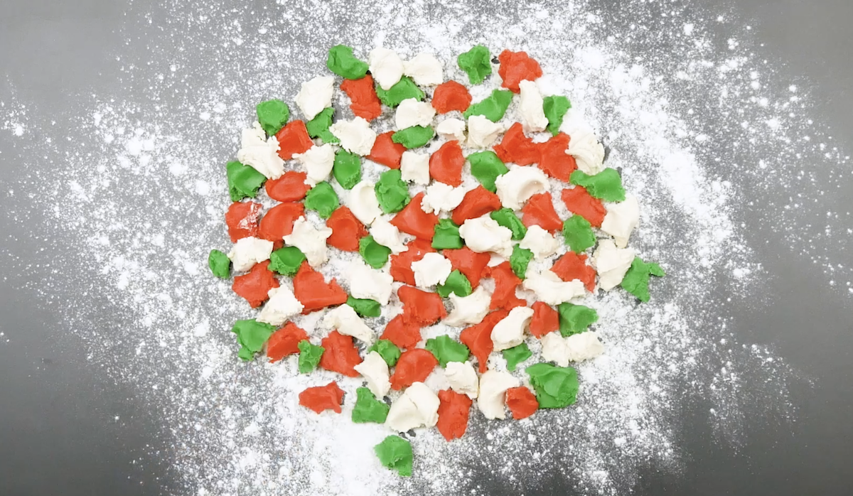 6.1 Divisez la moitié restante de la pâte brisée de la recette précédente en 3 morceaux de taille égale. Colorez ces morceaux avec du colorant alimentaire vert, rouge et blanc. Mettez à nouveau la pâte au frais pendant au moins 30 minutes.