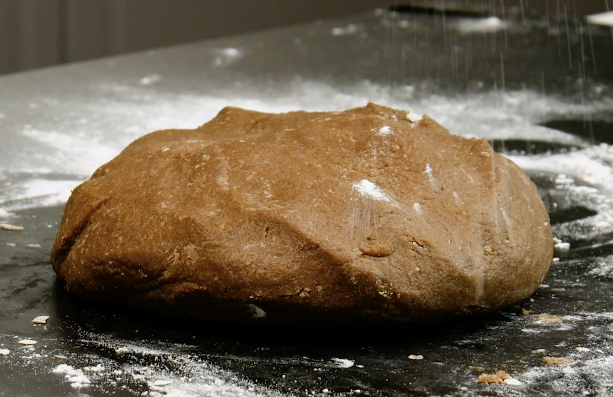 Ajoutez les amandes, la farine, toutes les épices et l’œuf au mélange et pétrissez le tout avec un crochet à pâte. Dissolvez le bicarbonate avec 2 cuillères à soupe d’eau et ajoutez-le à la pâte. Continuez à pétrir la pâte à vitesse maximale jusqu’à ce qu’elle soit brillante et ne colle plus. Elle doit être ferme et malléable. (Si la pâte n’atteint pas la consistance souhaitée, il suffit d’ajouter un peu plus de farine). Couvrez le saladier de film alimentaire et laissez la pâte reposer au réfrigérateur pendant au moins 4 heures, de préférence toute la nuit.