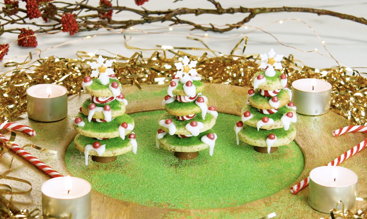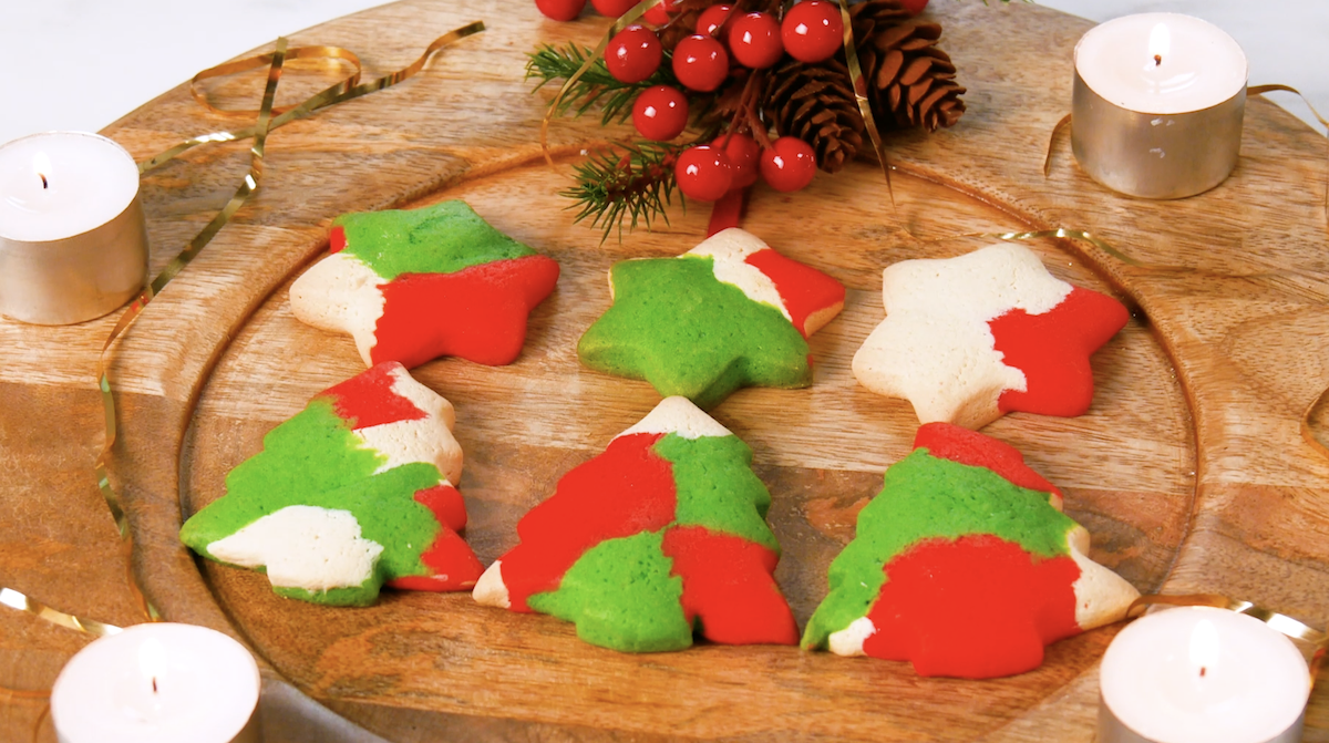 2.2 Une fois les biscuits refroidis, vous pouvez “assembler” les sapins de Noël. Mélangez le sucre avec du colorant alimentaire vert et saupoudrez les biscuits avec.