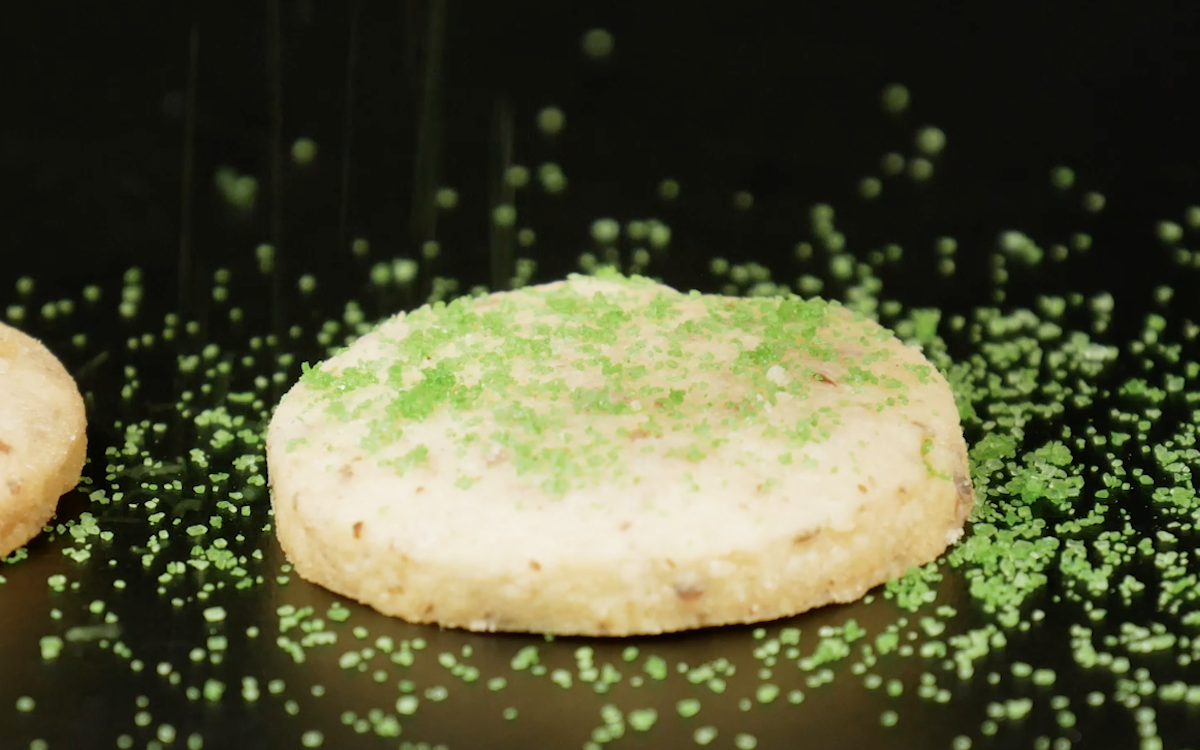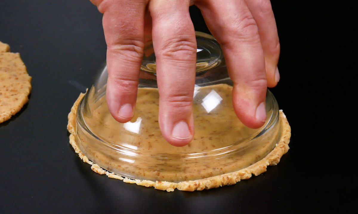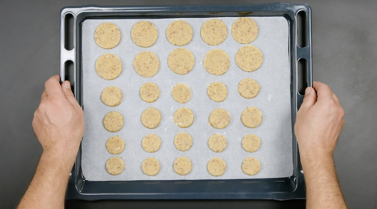 1.1 Formez de petites boules (de la taille d’une balle de ping-pong) avec la pâte. Ensuite, aplatissez les boules avec un verre. Découpez des cercles dans la pâte à l’aide d’un petit bol en verre. Enfournez ces cercles à 175 °C pendant 7 minutes jusqu’à ce qu’ils soient bien dorés. Ensuite, laissez les biscuits refroidir.