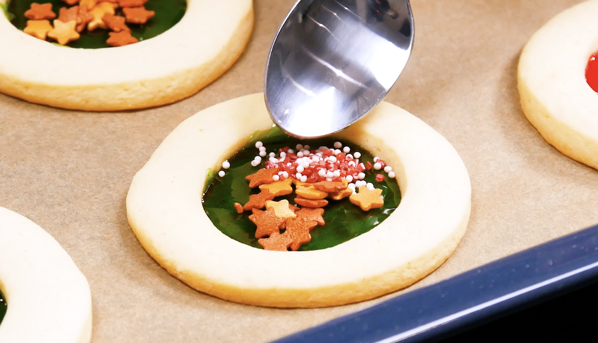 5.3 Laissez ensuite les biscuits refroidir. Remplissez la moitié des biscuits avec des perles de sucre et d’autres décorations en sucre.