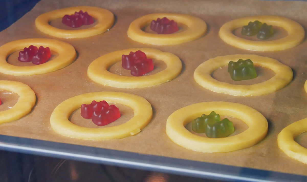 5.2 Placez les anneaux sur une plaque à pâtisserie recouverte de papier sulfurisé et placez 2 oursons en gélatine au centre de chaque anneau. Faites cuire le tout pendant 5 à 7 minutes à 165 °C.