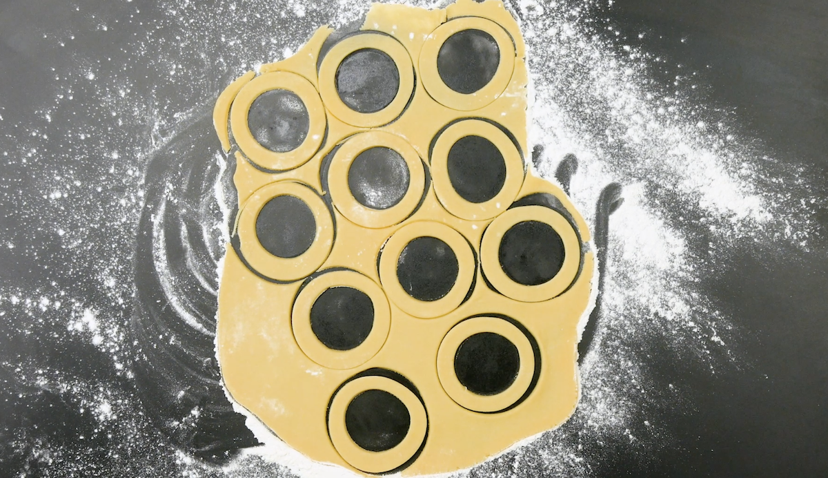 5.1 Coupez la pâte en deux et étalez-en une moitié (gardez l’autre moitié pour les prochains biscuits). Découpez des cercles avec un verre. Utilisez ensuite un verre plus petit pour faire des cercles plus petits à partir des grands cercles, pour former un anneau.