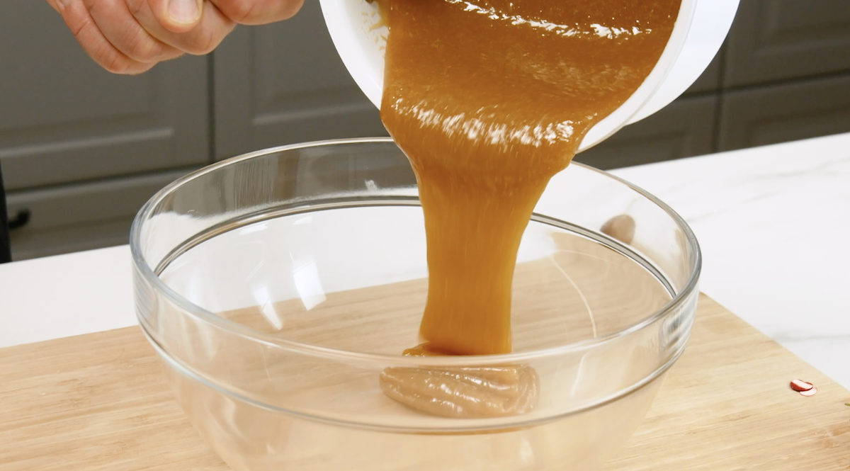 Mettez le miel avec le sucre et le beurre dans une casserole. Chauffez le tout en remuant constamment jusqu’à ce que le sucre soit dissous. Retirez le mélange du feu, versez le tout dans un saladier et laissez refroidir.