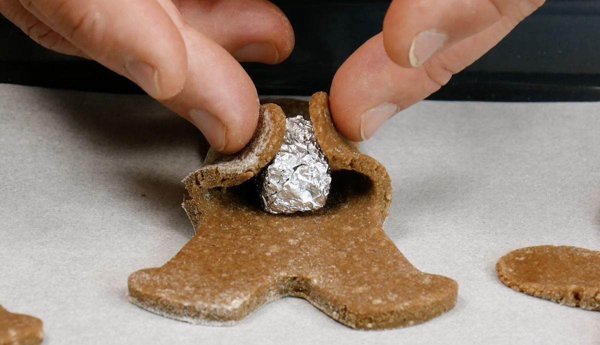 3.1 Sortez la pâte du réfrigérateur et étalez-la sur une épaisseur d’environ 0,5 cm. Utilisez ensuite un emporte-pièce pour découper les bonhommes en pain d’épices. Formez maintenant des petites boules avec le papier aluminium (environ 20 x 20 cm de papier par boule) et mettez-les sur le corps des bonhommes. Pliez leurs bras vers l’intérieur pour qu’ils aient l’air de tenir la boule. Faites cuire les bonhommes pendant environ 10 à 12 minutes à 175 °C.