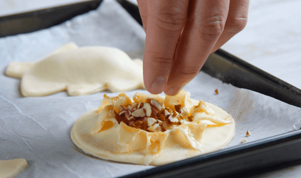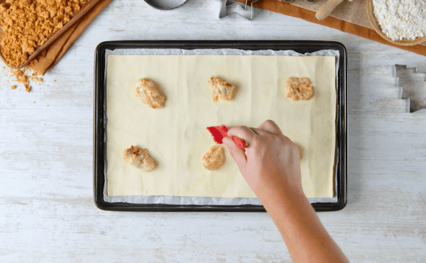 - Retirez les chutes de pâte feuilletée de la plaque de cuisson autour des biscuits. Coupez les biscuits fourrés au milieu avec une paire de ciseaux et séparez les "rayons" de pâte pour former un soleil. Mettez quelques amandes hachées au milieu. Mettez ensuite la plaque au four à 190°C pendant 15 minutes.