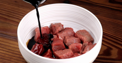 - Coupez le rumsteck en gros morceaux.Déposez-les dans un saladier dans lequel vous versez tous les ingrédients pour la marinade. Mélangez bien.Laissez mariner pendant minimum deux heures.