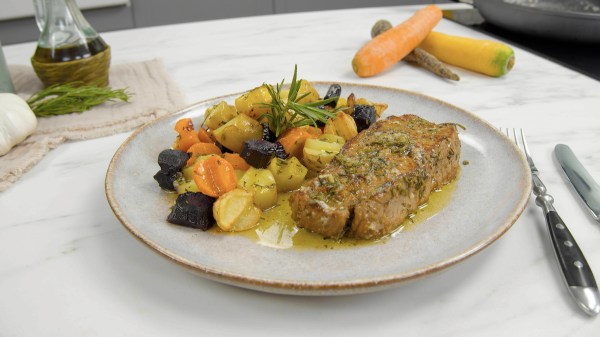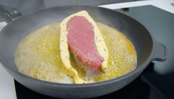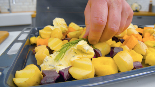 Parmi les amateurs de la viande, une nouvelle tendance jouit d’une grande popularité : il s’agit du procédé Butter-Dry-Aged. La viande mûrit jusqu’à 28 jours dans une enveloppe de beurre. Elle devient ainsi littéralement tendre comme du beurre. Mais si vous ne voulez pas attendre 28 jours pour votre viande, vous pouvez aussi la préparer de cette manière. Nous recouvrons une belle pièce de bœuf d’un épais manteau de beurre aux herbes fait maison, puis nous le faisons cuire à la poêle dans ce beurre. Et en accompagnement : de délicieux légumes au four.