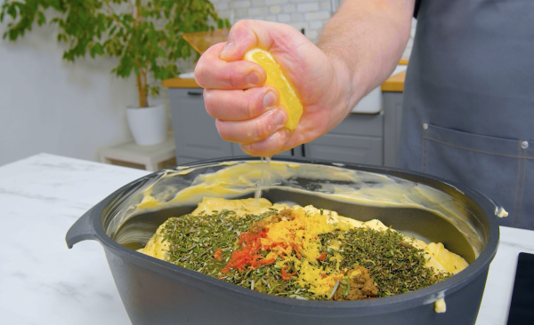 - Amenez le beurre à température ambiante. Ajoutez l'ail haché, le thym, le romarin, le piment, les anchois, le zeste et le jus d'un citron, du sel et du poivre et mélangez le tout.