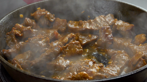 • Faites frire la viande à feu vif. Assurez-vous qu'il n'y ait pas trop de viande dans la poêle en même temps, sinon la viande perdra trop de jus et les bouchées seront cuites plutôt que frites. Quand les morceaux sont dorés, ajoutez le beurre et l'ail.