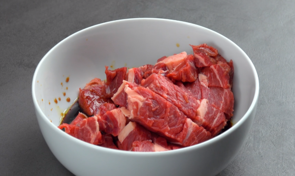 • Coupez le bœuf en morceaux. Pour la marinade, mélangez la sauce piquante et l'huile d'olive avec le jus de citron dans un saladier et faites-y mariner les morceaux de viande pendant environ 15 minutes.