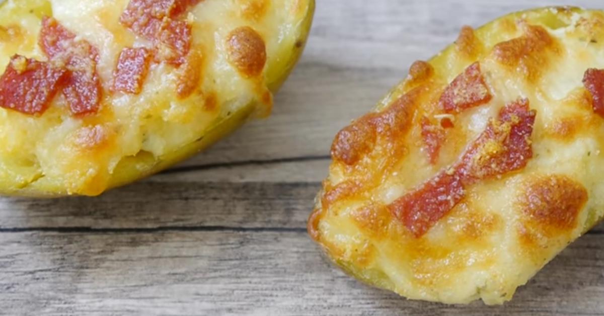 - Coupez chaque pomme de terre en deux et enlevez une bonne partie de la chair avec une cuillère, en en laissant tout juste assez pour garder la peau de la pomme de terre bien ferme.