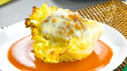 - Placez les feuilles de chou de Milan blanchies dans un moule à muffins graissé. Déposez une boulette de viande remplie de fromage dans chaque cavité.