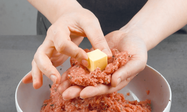- Mélangez la viande hachée avec le persil finement haché, l'œuf, l'oignon coupé en dés et la chapelure et formez plusieurs galettes. Coupez le fromage en cubes et placez un cube sur chaque galette de viande. Refermez maintenant la viande hachée sur les cubes de fromage et formez des boulettes de viande.