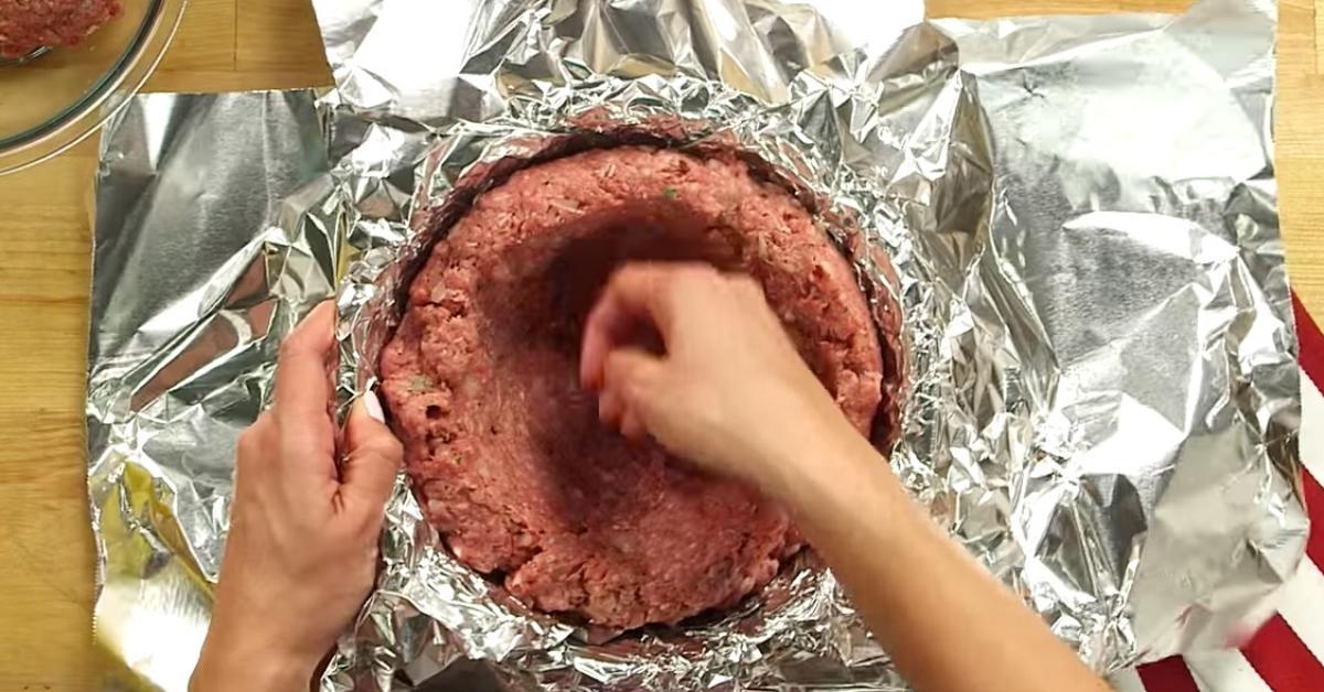 - Recouvrez le fond d'un saladier (allant au four) de papier aluminium et mettez les 2/3 restants de viande à l'intérieur. Utilisez vos mains pour modeler la viande dans le saladier en laissant un trou au milieu (les spaghetti iront dans ce trou). Assurez-vous d'avoir fait des bords assez épais pour éviter que la boule ne casse lors de la cuisson. Ajoutez les pâtes et utilisez le restant de viande pour refermer la boule de viande. Assurez-vous que le tout soit bien fermé.