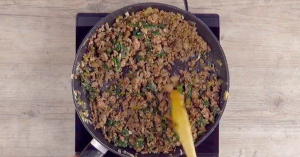 - Hachez finement l'oignon et l'ail et faites-les revenir dans une poêle avec le sel, le poivre, la viande hachée et les épinards.
