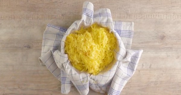 - Pelez les pommes de terre et râpez-les finement. Mettez-les ensuite dans une serviette et pressez le liquide. Versez les pommes de terre râpées dans un saladier. Ajoutez les œufs, le sel, le poivre et le parmesan, et mélangez bien.