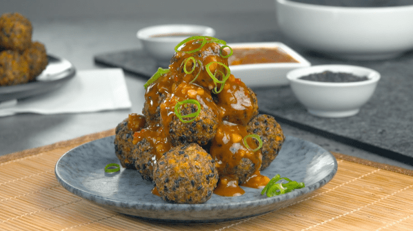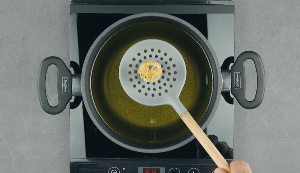 - Mettez le mélange dans un saladier et ajoutez le sel, la Maïzena, la farine de maïs et les graines de sésame noir. Mélangez tout. Formez de petites boules et faites-les frire dans de l'huile chaude. Laissez les boules bien s'égoutter sur des feuilles d'essuie-tout.Conseil : faites d'abord frire une boule test avant de former toutes les boules pour être sûr que tout tient bien en place. Si ce n'est pas le cas, vous pouvez ajouter un peu plus de Maïzena et de farine de maïs.