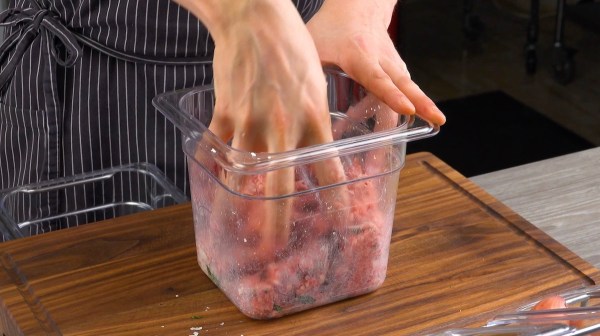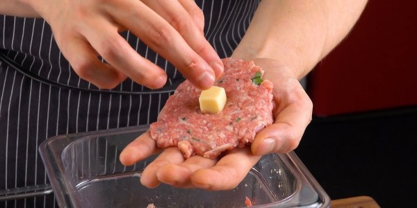 • Pressez une partie de la masse de viande hachée dans la paume de votre main et placez un cube de fromage au milieu. Enveloppez complètement le cube de fromage avec la viande hachée et formez une boulette.