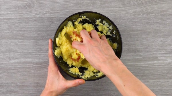 • Épluchez les pommes de terre et faites-les bouillir dans de l'eau salée. Pendant ce temps, faites frire le lard des deux côtés dans la poêle et coupez-le en petits morceaux. Écrasez les pommes de terre et mélangez-les avec les lardons.