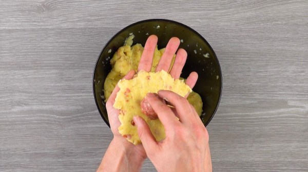 • Pressez une partie du mélange de pommes de terre dans la paume de votre main et placez une boulette de viande au milieu. Couvrez complètement la boulette de viande avec le mélange de pommes de terre, puis roulez le tout en boule.