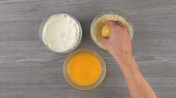 • Roulez la boule de pomme de terre farcie dans la farine, dans l'œuf battu et roulez-la dans la chapelure Panko. Enfin, faites frire la boule jusqu'à ce qu'elle ait une couleur brun doré.