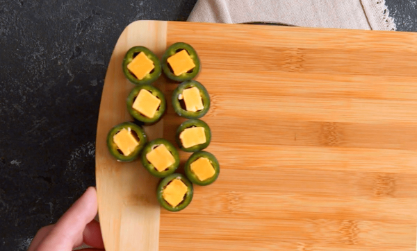 - Coupez les extrémités des jalapeños et retirez délicatement les graines à l'intérieur. Coupez le cheddar en lanières et insérez une lanière dans chaque jalapeño. Coupez ensuite les jalapeños farcis en deux.