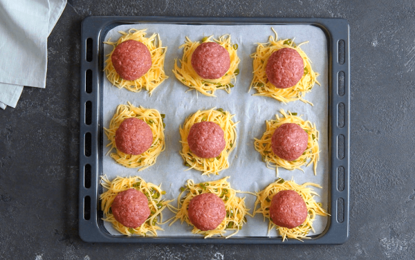 - Saupoudrez les boulettes de viande farcies de mozzarella râpée et faites cuire le tout pendant 30 minutes à 180 °C, à chaleur tournante.