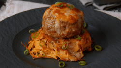 Boulettes de viande farcies aux épices sur des nids de pommes de terre croustillants