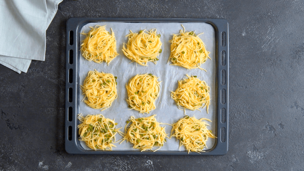 - Divisez le mélange de pommes de terre en neuf portions égales et déposez celles-ci sur une plaque de cuisson recouverte de papier sulfurisé.