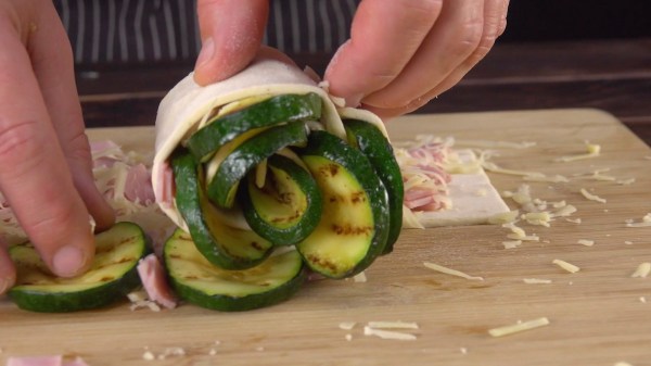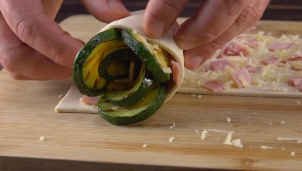 - Déposez les tranches de courgettes sur l'une des bandes de pâte et roulez la pâte dans le sens de la longueur pour qu'une petite fleur se forme.