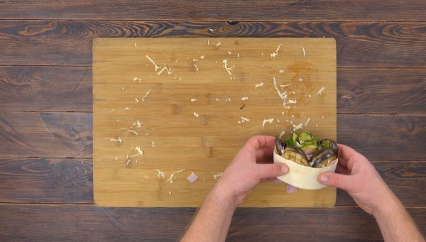 - Déposez les tranches d'aubergine sur les deux dernières bandes de pâte et répétez l'opération jusqu'à ce que vous ayez une fleur gigantesque dans les mains.