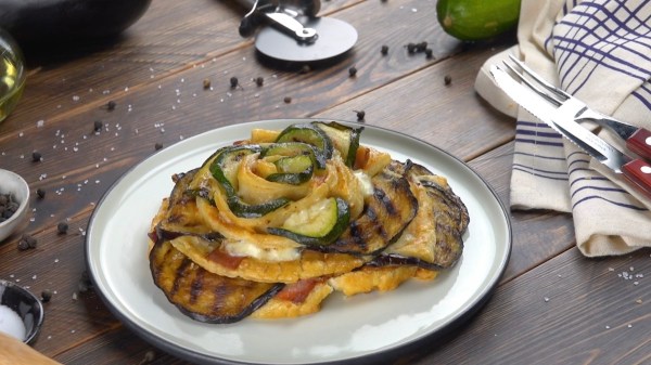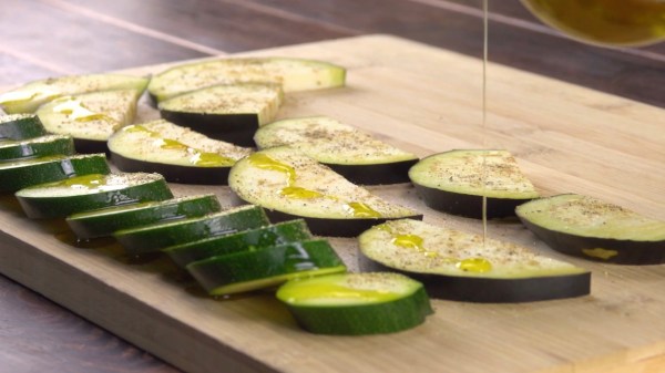 - Coupez la moitié d'une courgette et la moitié d'une aubergine en tranches puis coupez les tranches d'aubergine en deux. Assaisonnez les légumes avec du sel et du poivre et versez de l'huile d'olive dessus.