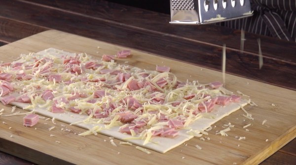 - Coupez le jambon cuit en petits carrés et étalez-les sur les quatre bandes de pâte feuilletée avec le fromage râpé.